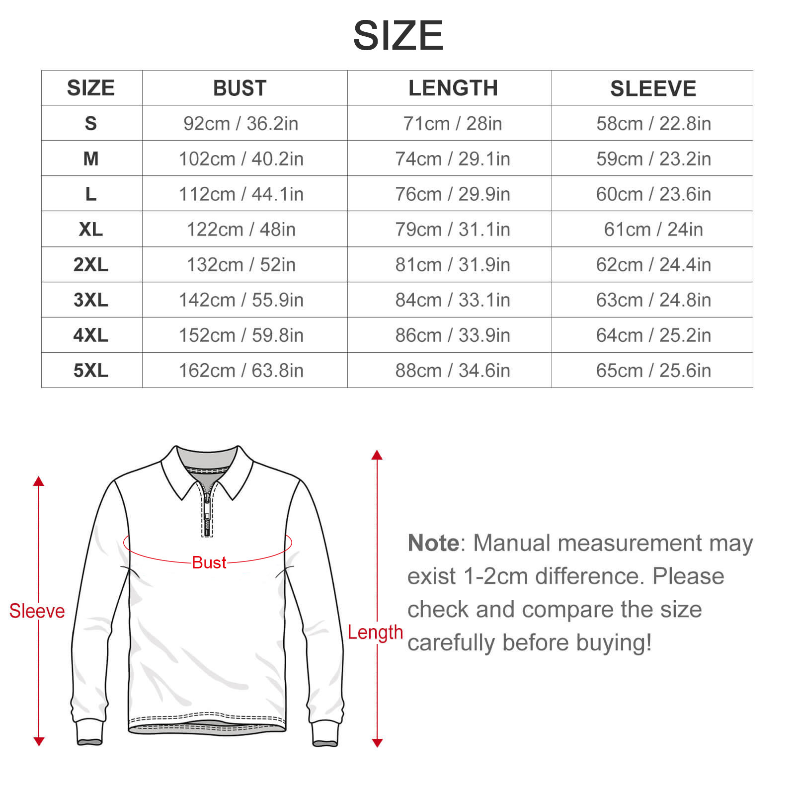Note: All sizes are European sizes, and the data is measured when laid flat. Due to different measurement methods, errors within 1-2cm are normal. Please do not use the same color as the base color of the clothes in the design picture, otherwise it will cause the ink to not come out during production, and it will not be included in the after-sales treatment.